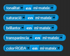 Fixeu-vos que podeu obtenir el color en format RGBA o, alternativament, podeu obtenir la tonalitat, la saturació i la brillantor (així com la transparència). L’opció «en mi mateix» significa que detecta el color del punt sobre el qual està el mateix personatge. Si està sobre d’un altre personatge, detectarà el color d’aquell personatge. Si està sobre l’escenari, detectarà el color de l’escenari. Una altra possibilitat és utilitzar «en punter de ratolí», opció amb la qual estareu detectant el color del punt que assenyala en aquell moment el ratolí.