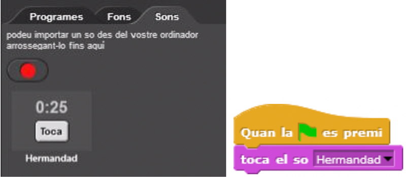 Penseu que si voleu, Snap! també us permet enregistrar la vostra pròpia veu. Per a fer-ho, cal tenir un micròfon a l’ordinador i, senzillament, prémer el botó vermell de la pestanya sons.