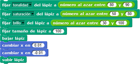 A partir de ahí, habrá que programar qué sucede cuando cada clon empieza a ejecutarse. En nuestro ejemplo vamos a hacer que cada clon dibuje un cuadrado (la baldosa) de 100 x 100. Estableceremos el color de manera aleatoria, jugando con los valores de tonalidad, saturación y brillo. Una vez dibujado el cuadrado, habrá que pintarlo del mismo color. Lo podemos hacer con la instrucción «rellena». Esto significa que primero tendremos que colocar el clon dentro del cuadrado, ya que cuando lo termina de dibujar vuelve a estar en el punto inicial (sobre la línea) y, por lo tanto, la instrucción rellanar no funcionaría. En el ejemplo, subamos el lápiz y movámonos 50 puntos hacia la derecha y 50 puntos hacia abajo (así estaremos en el centro). Es importante recordar subir el lápiz, porque de lo contrario, aunque nos movamos hacia el interior del cuadrado, seguiremos estando sobre la línea que dibujamos y rellenar no funcionará.
