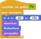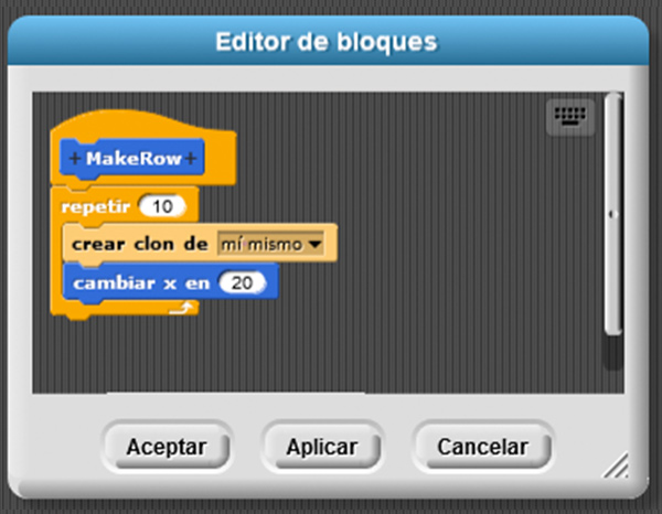 Centrándonos en nuestro ejemplo, necesitamos un personaje que sea un cuadrado (podemos dibujarlo con el Paint de la Snap! o abrir una imagen de un cuadrado). Para empezar, crearemos un nuevo bloque llamado «MakeRow», que nos servirá para crear una fila de diez clones. Lo haremos así: