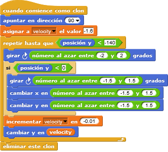 En «repite», en cada iteración sumamos un valor negativo a la Y para que el cuadrado vaya bajando. Este valor que sumamos a Y lo tenemos guardado en la variable «velocity», la cual vamos incrementando con cada iteración, para que así vaya bajando cada vez más rápido. El resto de bloques son pequeños giros y desplazamientos aleatorios, que se acentúan cuando el cuadrado llega a una posición Y por debajo de 0.