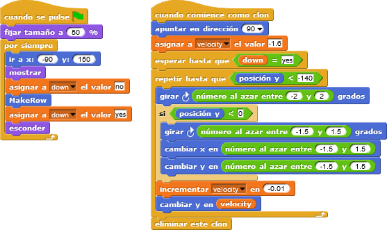 Así pues, cada cuadrado repite todas estas instrucciones cuando nace hasta que llega a una posición Y por debajo de –140. Entonces se autoelimina mediante la instrucción «borra este clon».