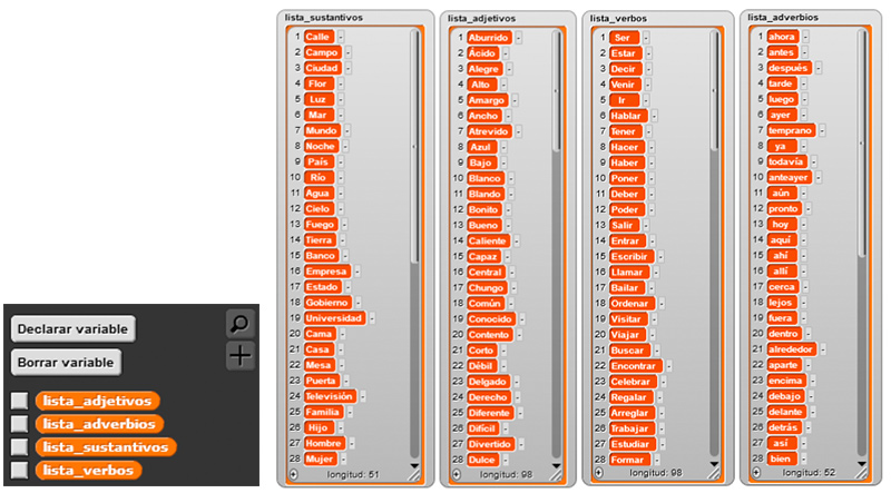 Si abrís este ejemplo con Snap!, veréis un proyecto en el que ya hay cuatro listas creadas. Son listas de los sustantivos, verbos, adverbios y adjetivos más comunes en castellano.